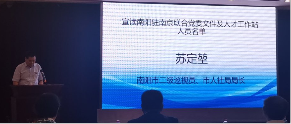 南陽(yáng)市委常委、組織部長(zhǎng)李永致辭 南陽(yáng)市人社局局長(zhǎng)蘇定堃宣讀關(guān)于成立南陽(yáng)市駐南京聯(lián)合黨委的通知和南陽(yáng)市駐南京人才工作站名譽(yù)站長(zhǎng)、副站長(zhǎng)、招才引智大使人員名單。 南陽(yáng)市招商和會(huì)展服務(wù)中心主任王峰介紹南陽(yáng)市對(duì)外開放及招商引資情況。