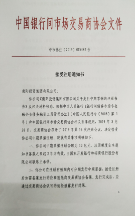 10月14日,南陽投資集團有限公司黨委書記、董事長楊振中、國家開發(fā)銀行河南省分行市場與投資處處長張東東、招商銀行南陽分行行長金建軍等中期票據(jù)(MTN)發(fā)行相關(guān)人員一行等,赴北京中國銀行間交易商協(xié)會領(lǐng)取中期票據(jù)注冊通知書。本次中期票據(jù)發(fā)行全國共有港閘國資、華潤資產(chǎn)、長春高新、蘇寧易購、南陽投資等11家政府類平臺或電商企業(yè)領(lǐng)取了注冊通知書。10月16日,從中國銀行間市場交易商協(xié)會再次傳來消息,南陽投資集團有限公司申請注冊發(fā)行的20億元3+2年期非公開定向債務(wù)融資工具(PPN)正式獲準(zhǔn)注冊,這是我市歷史上首單平臺類私募債券。至此,南陽投資集團有限公司在銀行間市場上債券直接融資規(guī)模擴大至30億元。
