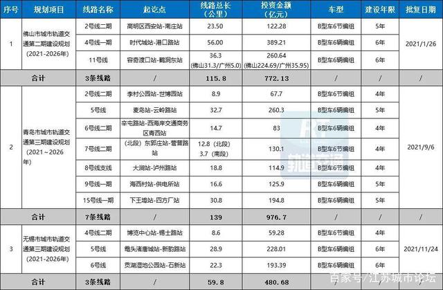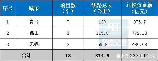 其次是佛山市,3項(xiàng)城軌建設(shè)項(xiàng)目,總長(zhǎng)115.8公里,總投資金額772.13億元。