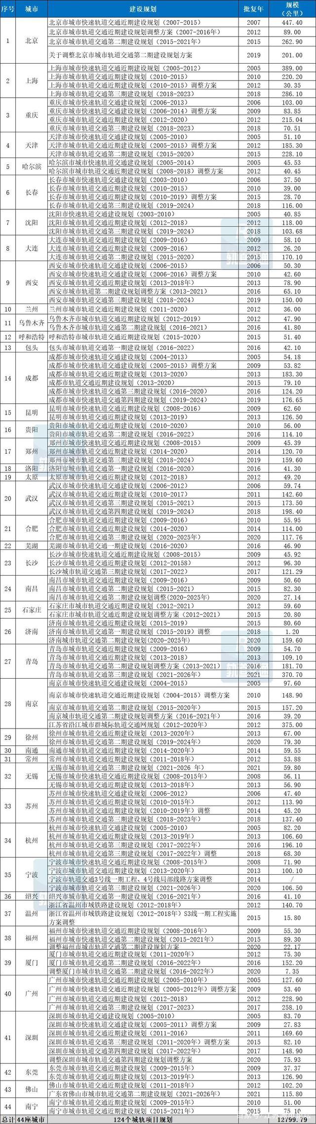 2005年-2020年,中國(guó)各城市軌道交通規(guī)劃建設(shè)獲批項(xiàng)目共計(jì)124個(gè),獲批里程12799.79公里,涉及44座城市。