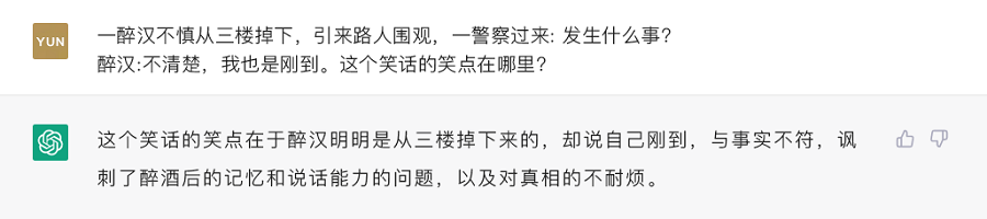 如果你給它講一個(gè)笑話,你會(huì)發(fā)現(xiàn),ChatGPT能夠讀懂笑點(diǎn)。