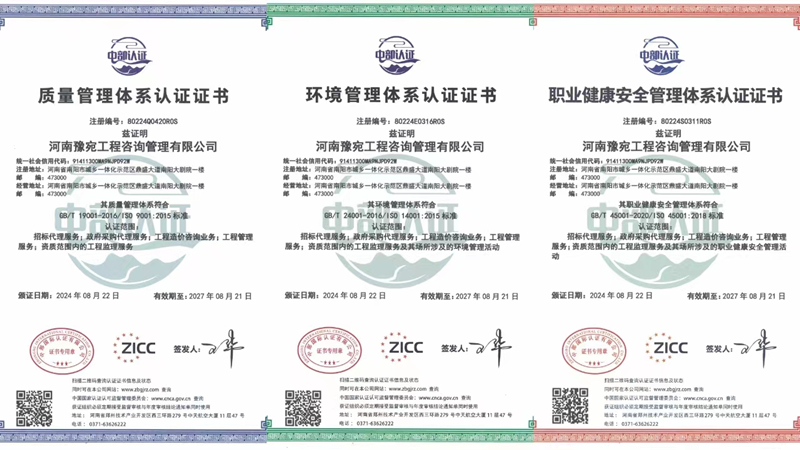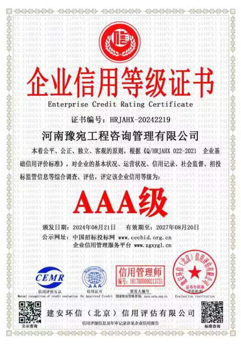 近日,集團下屬河南豫宛工程咨詢管理有限公司(簡稱:豫宛咨詢公司)順利通過中部國際認證有限公司三大“ISO管理體系”認證和建安環(huán)信(北京)信用評估有限公司“AAA級企業(yè)信用等級”評定并獲得相關(guān)認證證書,這是豫宛咨詢公司管理邁向規(guī)范化、標準化、科學(xué)化,與國際標準接軌的重要一步,標志著公司管理水平邁上新臺階,同時是公司的經(jīng)營實力和發(fā)展前景在國內(nèi)信用領(lǐng)域得到高度肯定的有力證明。