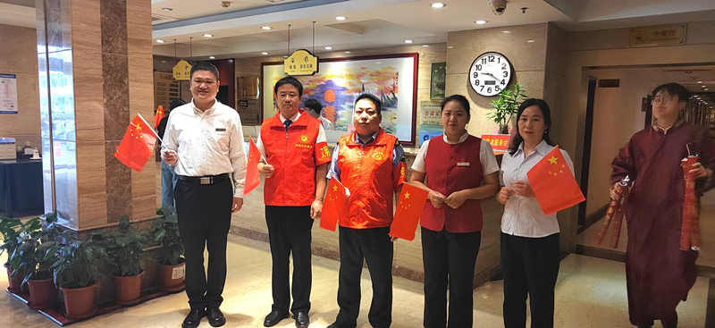 十月一日,秋高氣爽,南陽賓館南大門嶄新的五星紅旗迎風(fēng)飄揚(yáng),客房樓前的電子屏上滾動著“熱烈慶祝中華人民共和國成立75周年!”的宣傳標(biāo)語;餐廳前的展臺上繪出了天安門、鮮花、彩色氣球和祖國萬歲的圖案;前臺接待員、樓層服務(wù)員、保安人員身著志愿者服裝,笑迎八方來賓。三對新人選擇在南陽賓館舉辦婚禮,迎親的紅旗車隊(duì)和中式婚禮殿堂洋溢著喜慶的中國紅,呈獻(xiàn)出舉國同慶、國泰民安的祥和氛圍。