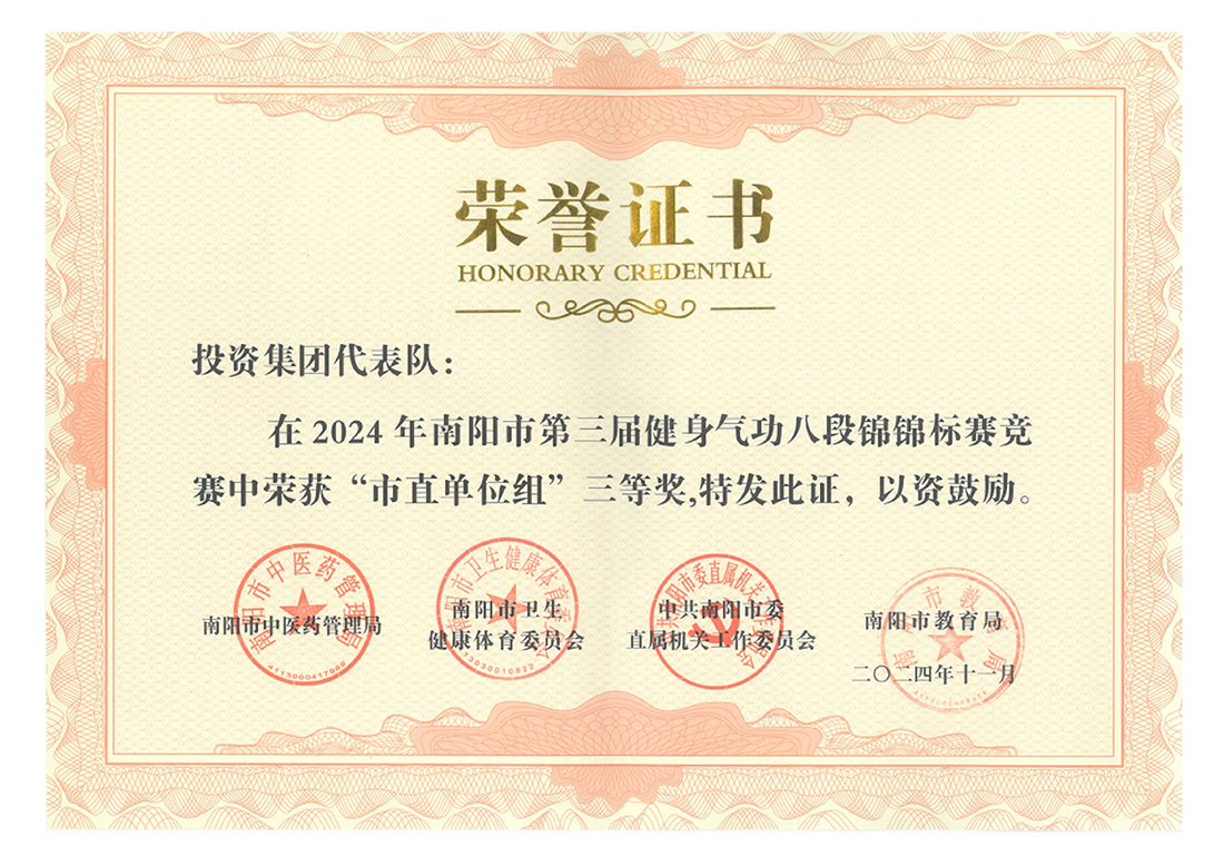 由南陽市中醫(yī)藥管理局、南陽市衛(wèi)生健康體育委員會、中共南陽市委直屬機關(guān)工作委員會、南陽市教育局聯(lián)合主辦的“南陽市第三屆健身氣功八段錦錦標賽”于2024年10月29日至30日成功舉辦。南陽投資集團代表隊同來自市直各單位的20支代表隊齊聚一堂,同臺競技,首次參賽榮獲“市直單位組”三等獎。