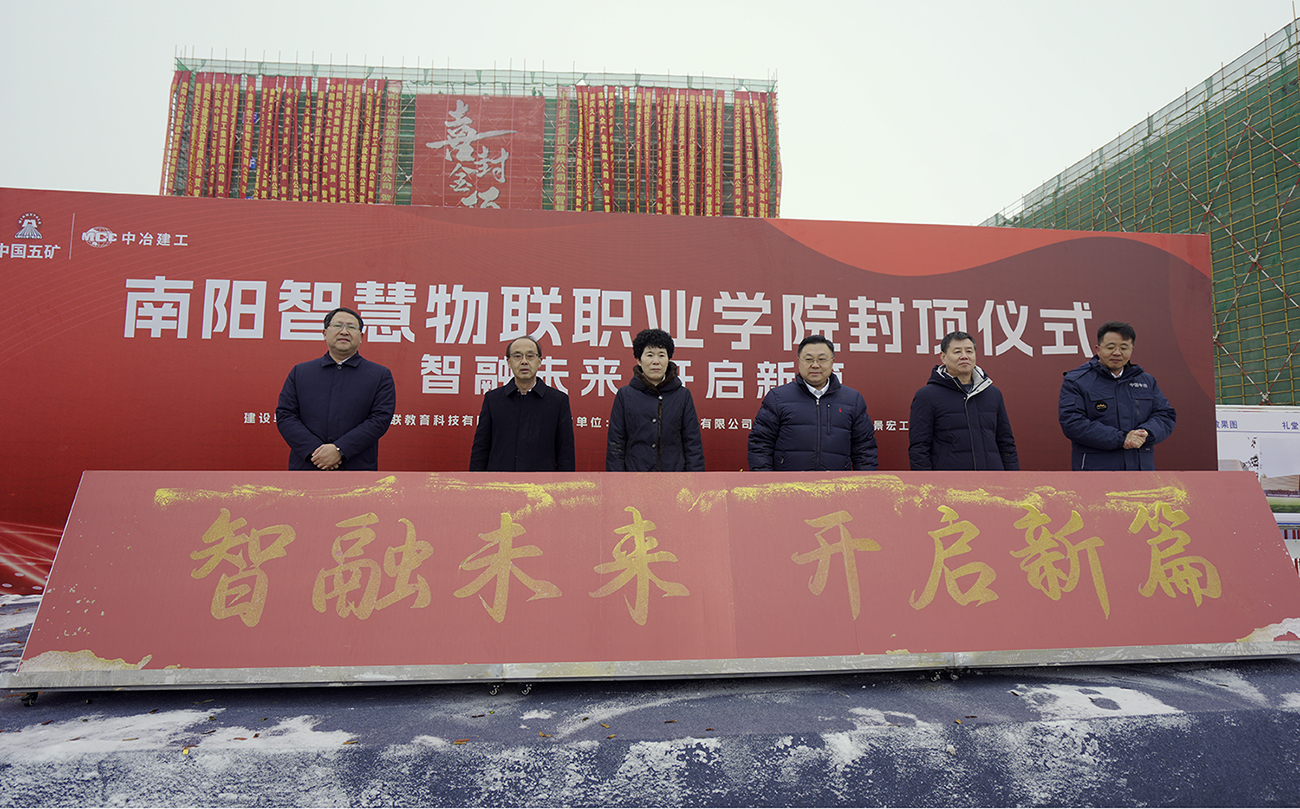 南陽市城鄉(xiāng)一體化示范區(qū)管委會副主任童孟軍,中冶建工集團有限公司海外分公司總經(jīng)理吳斌,山水智聯(lián)教育科技有限公司總經(jīng)理訾建軍,南陽投資集團黨委委員、副總經(jīng)理楊濤出席封頂儀式。
