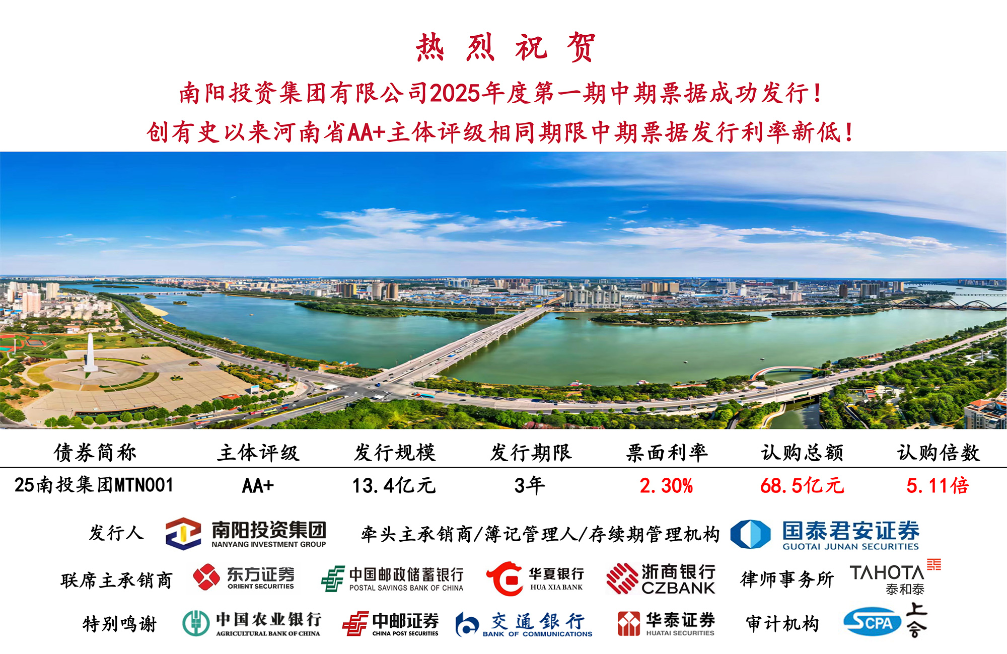 3月27日,南陽投資集團有限公司2025年第一期中期票據(jù)(25南投集團MTN001)成功發(fā)行。本期債券發(fā)行規(guī)模13.4億元,期限3年,票面利率2.30%,創(chuàng)河南省AA+主體評級相同期限中期票據(jù)發(fā)行利率新低!本次發(fā)行認購總額68.5億元,全場認購倍數(shù)5.11倍,牽頭主承銷商為國泰君安證券,東方證券、中國郵政儲蓄銀行、華夏銀行、浙商銀行擔任聯(lián)席主承銷商。
